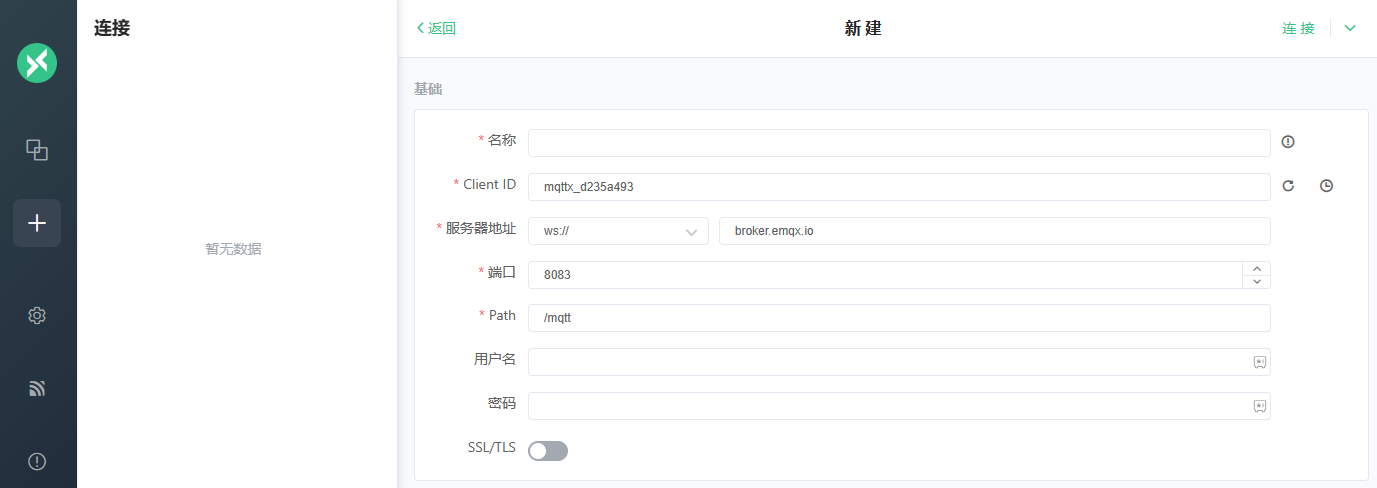 MQTTX 中新建 EMQX 连接,确保主机、端口、账号和连接协议准确
